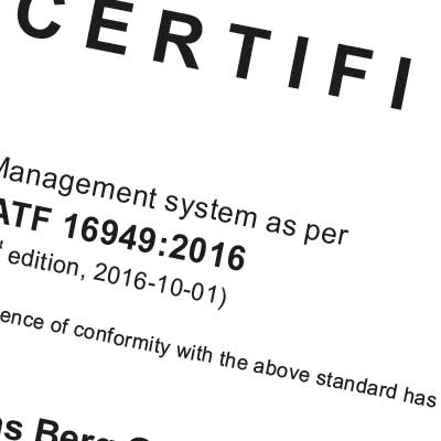 At Berg, quality and environmental management are fully integrated in all processes and procedures – and firmly embedded as core components of the company policy. Both internally and externally, our efforts are documented by the demanding and strict certification requirements of DIN EN ISO 9001:2008 and DIN EN ISO 14001:2004. They signal the company's ambitious aspirations regarding responsible treatment of people and environment. In addition, Berg's management system also meets the technical specifications of the international automotive industry according to ISO/TS 16949:2009.